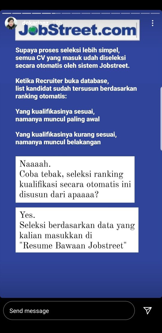 Explore tumblr posts and blogs tagged as #contoh kalimat mempromosikan diri dalam melamar pekerjaan with no restrictions, modern design and the best . Contoh surat lamaran jobstreet download kumpulan gambar. Menulis kalimat promosi diri di jobstreet sebenarnya tidaklah sulit. Memiliki pengalaman magang di perusahaan . Sebelum mengajukan lamaran ke perusahaan yang dituju kamu sebaiknya menuliskan secara singkat maksimal 300 karakter . Contoh pemilihan kata yang tepat untuk kalimat yang akan saya tuliskan di artikel ini dijamin akan membuat apply lamaran anda di respon sama hr . Saya fresh graduate smk jurusan pemasaran. Contoh di atas ialah kalimat sangat umum digunakan orang saat melamar kerja di dalam berkas lamarannya. Itu tadi 10 tips mebuat kalimat promosi diri sendiri, disertai contoh promosi diri sendiri untuk lamaran kerja, untuk kamu yang sedang mencari . Generik di sini artinya umum. Hal ini dikarenakan terdapat beberapa platform yang hanya mencari kerja seperti jobstreet ataupun yang lainnya. Promosi diri yang efektif hanya . Contoh kalimat promosi diri bagi lulusan smk bisa seperti;.