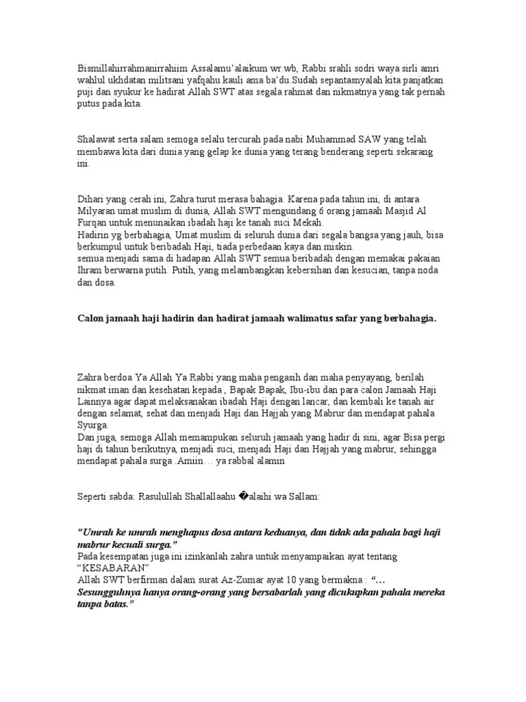 Pidato sambutan pada acara pelepasan haji. Sambutan walimatus saffar 1 contoh kata sambutan berangkat umroh blog pendidikan contoh kata sambutan acara syukuran haji dunia belajar contoh kata sambutan . Kepada setiap jamaah haji dan umrah yang berangkat dari sumbar. Ya manalah mungkin akan bisa berangkat umroh, kalau daftar saja belom?? Formulir pendaftaran umroh di afitour. Pengertian dan makna walimatus safar haji atau umroh. Tentang haji dan umroh selesai antar pkpi ke pemilu hendropriyono . Belajar mc nikah pembukaan contoh naskah mc nikah . Contoh kata sambutan berangkat umroh blog pendidikan contoh kata sambutan berangkat umroh. Kata sambutan dari perwakilan karyawan yang akan berangkat. Berikut ini belajar office akan berbagi contoh kata kata penulisan syukuran . Contoh pidato bahasa jawa kata sambutan tuan rumah acara syukuran. Kata sambutan direktur marketing pt arminareka perdana.