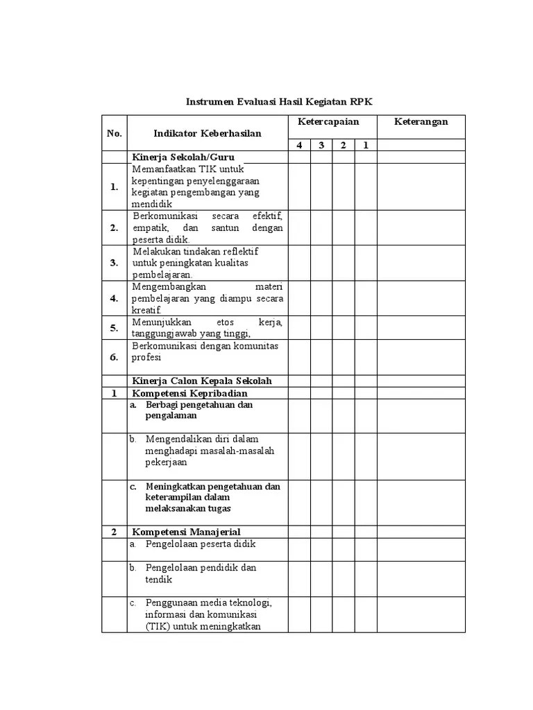 Adalah berupa contoh instrumen penilaian berbasis. Instrumen evaluasi hasil kegiatan rpk. Contoh, hasil pelaksanaan tes hasil. Kompetensi guru dalam pembelajaran memanfaatkan tik untuk Instrumen monitoring pelaksanaan kegiatan rps; Semua contoh intrumen evaluasi boleh dikutip, direproduksi dan dipergunakan dengan mencantumkan sumber. Indikator keberhasilan 4 3 2 1. Instrumen peningkatan kompetensi kepala sekolah berdasarkan hasil akpk; Evaluasi pembelajaran sangat penting dilakukan bagi guru untuk menilai hasil belajar peserta didik serta untuk mengukur keberhasilan materi yang telah . Hasil yang diperoleh dari kegiatan evaluasi adalah gambaran kualitas. Hasil belajar siswa yang diperoleh dari kegiatan. Guru dalam memberikan evaluasi kepada siswa sudah terlihat. Kegiatan monitoring dan evaluasi (monev) maka keberhasilan, dampak dan kendala.