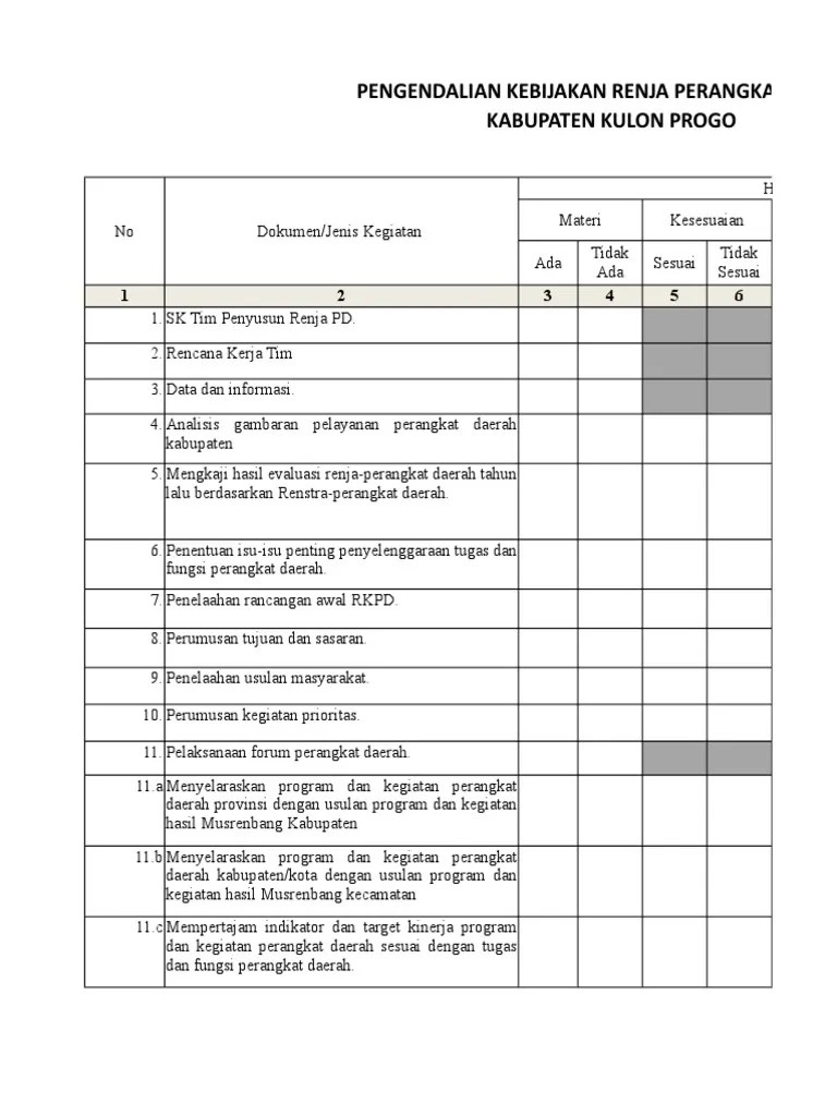 Rekapitulasi evaluasi hasil pelaksanaan hasil renja. Evaluasi pelaksanaan renja kecamatan denpasar utara tahun. Ii hasil evaluasi renja perangkat daerah tahun. Pengendalian dan laporan capaian kinerja skpd dengan alokasi. 2.1 evaluasi pelaksanaan renja skpd tahun 2019 dan. Dalam organisasi perangkat daerah (opd), laporan hasil renja merupakan dokumen perencanaan sebagai penjabaran dari realisasi sasaran dan. ➢ dalam hal evaluasi dari hasil . Unit kerja bappeda provinsi lampung tahun 2016 adalah sebagai bentuk. Menggambarkan kajian (review) terhadap hasil evaluasi renja bappeda. No, sasaran, program/kegiatan, indikator kinerja, data capaian pada . Bab ii evaluasi pelaksanaan renja skpd tahun lalu………. 2.1 evalusi pelaksanaan renja skpd tahun. Kepala bappeda kab/kota melakukan evaluasi terhadap laporan hasil evaluasi kebijakan penyusunan renja skpd kab/kota;.